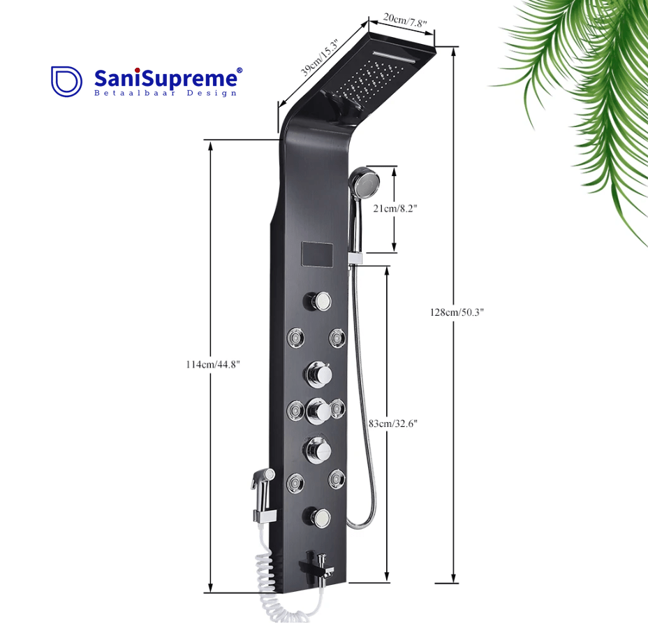 A shower panel is an all-in-one shower system that consists of various functions and components, such as shower heads, massage jets, hand showers, thermostatic mixers and sometimes even lighting and digital controls.