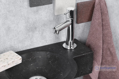With this Sanisupreme Teti 40x23x8 cm Limestone Black Fountain Set including tap and siphon set, you can complete your toilet. The set comes complete with a fountain tap and siphon set. The fountain is 40x23x8 cm and is therefore large enough to easily wash your hands. SaniSupreme supplies this product as a complete set including tap, siphon, and necessary installation materials and parts. The depth includes the curve. The tap and siphon are of high quality and finished in a matt chrome finish. The Sanisupreme Teti fountain has a plateau on two sides, making it very practical. The fountain can only be installed as shown in the photo, with the tap hole on the right.