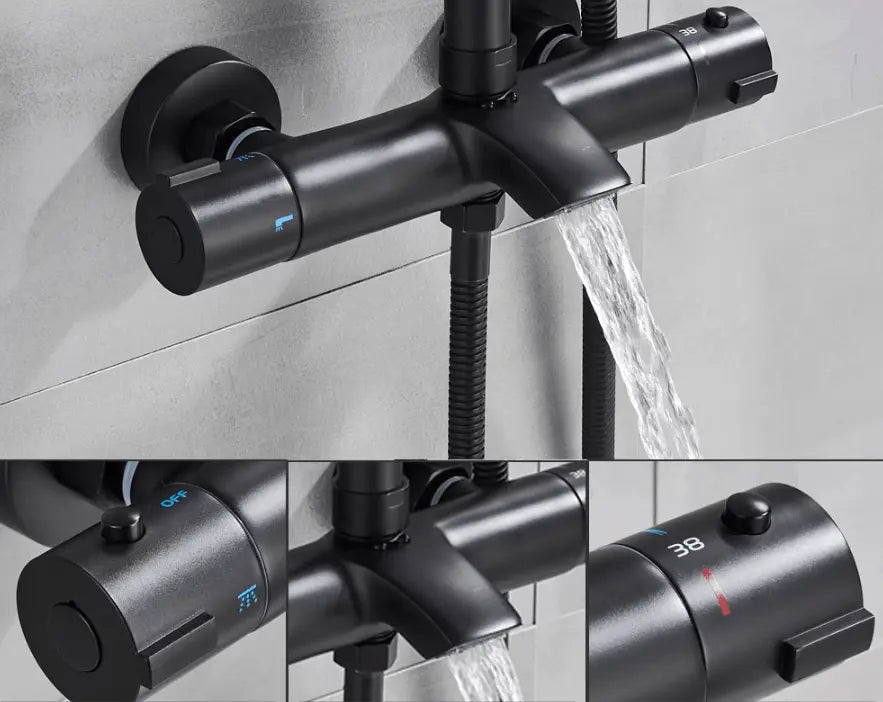 Beautiful, complete, high-quality shower set with an additional bath tap. Finished in matte black with a thermostatic mixer tap. Unlike the Florida, this set features a separate tap for the hand shower, separate from the mixer tap.