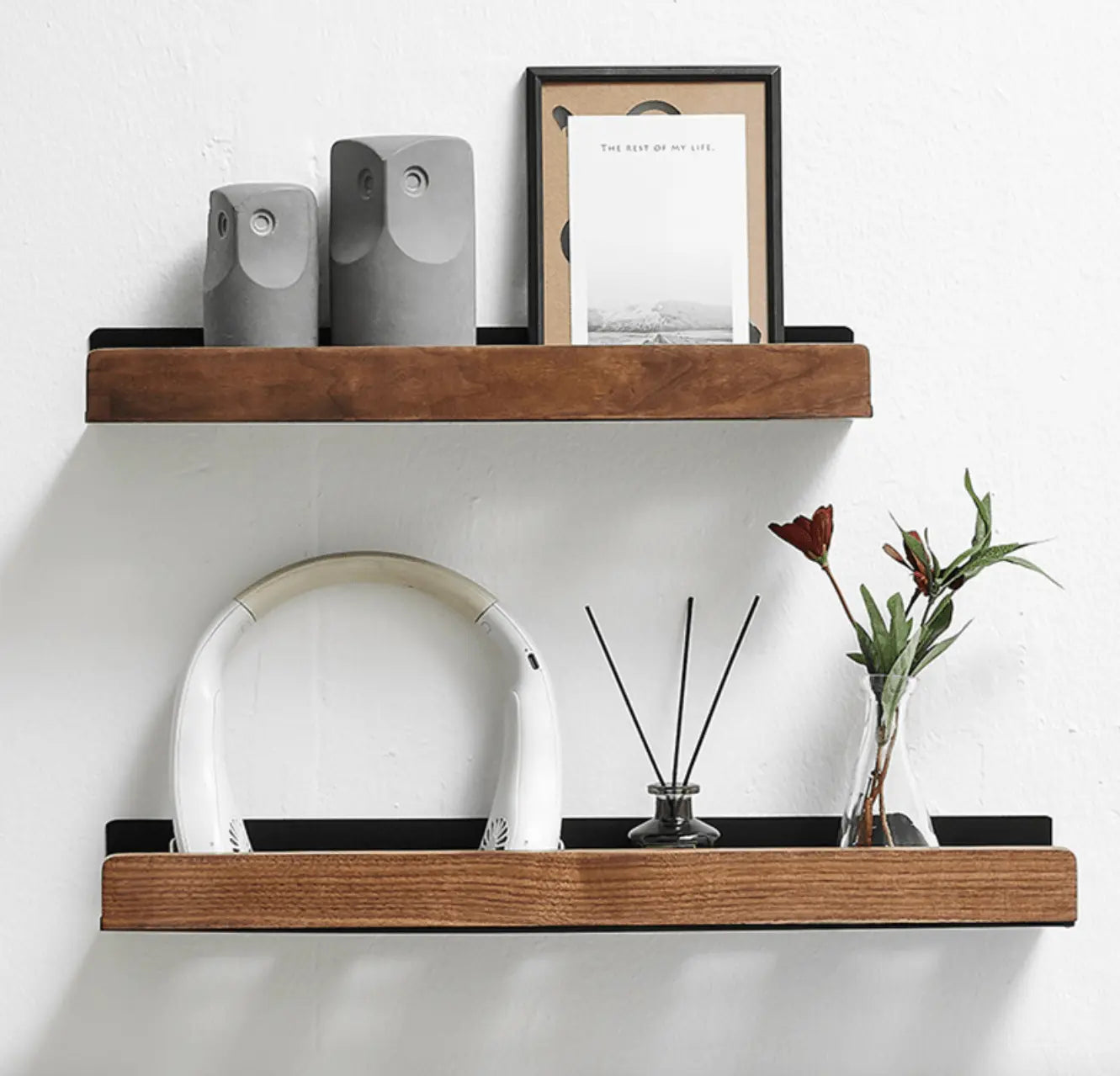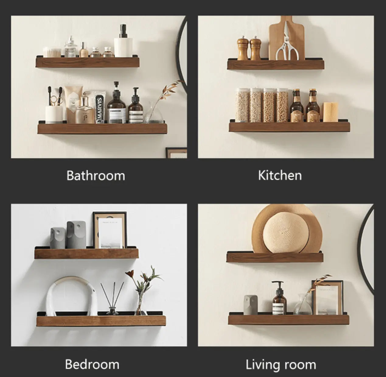 Sanisupreme design BlackLine Series wall shelf made of stainless steel with walnut wood edge. available in various sizes: 20, 30, 40 and 50 cm length.