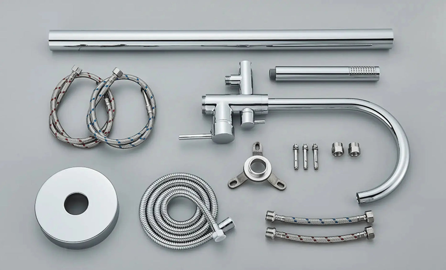 Bij een vrijstaande badkraan hoort een handdouche. Deze is, net als de badkraan, gemaakt van messing. Een stevig materiaal wat zeer goed in natte ruimtes gebruikt kan worden. De handdouche vorm is gelijk als de vorm van de badkraan, zeer elegant en stijlvol. De handdouche is voorzien van siliconen sproeigaatjes. Deze zijn eenvoudig te ontkalken.