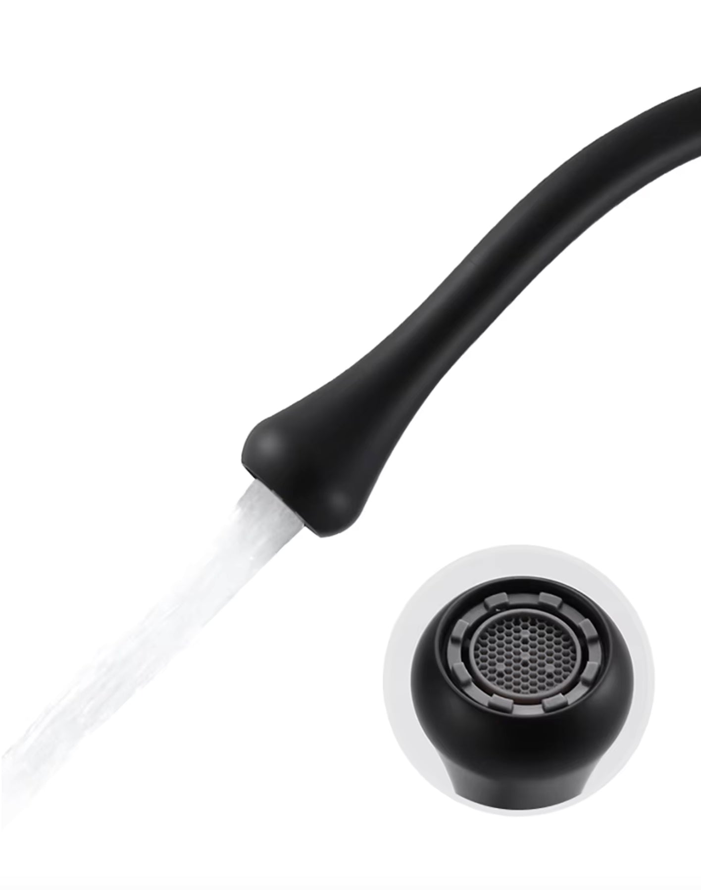 Stijlvolle wastafelkraan type SaniSupreme AquaSoft in mat zwart design uitvoering.