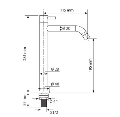 De kraan is 28.5 cm hoog en heeft een uitloop van 11.5 cm. De kraan geeft alleen koudwater.