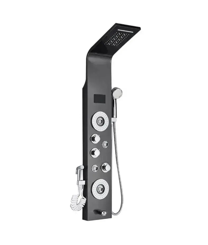 Komplete luxe Douchepaneel van Sanisupreme®. Type Palermo LCD Premium zwart. Douchepaneel met regendouche, 6 jets, waterval, uitloopkraan en handdouche. De unit heeft zelfs een kompleet LCD paneel dat werkt op waterdruk (dus geen stroom nodig !); hierop kan ondermeer de watertemperatuur en tijd van douchen worden afgelezen.